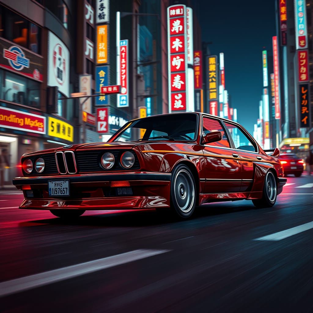 This image shows a vintage BMW M3 Touring speeding through the neon-lit streets of Tokyo, blending traditional and digital media in a maximalist, photorealistic digital painting, reminiscent of 80s and 90s concept art with meticulous attention to detail and atmospheric depth.