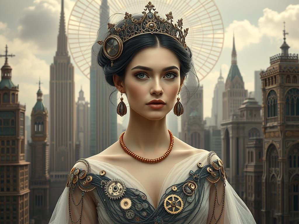 A portrait of a determined princess in a tesla punk kingdom, adorned with gears and wires, standing before a precise fractal cityscape with art deco elegance