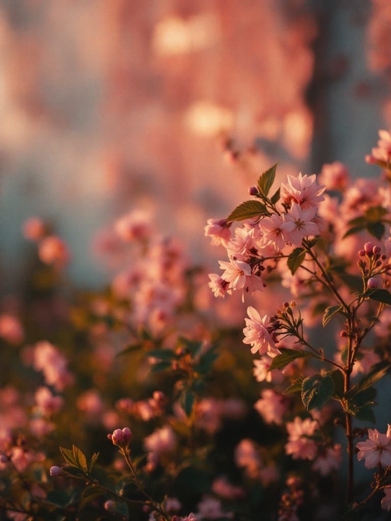 This image captures delicate pink flowers in soft focus, bathed in warm sunset light. The cinematic composition features a textured wall and atmospheric depth, creating a dreamy, resonant mood.
