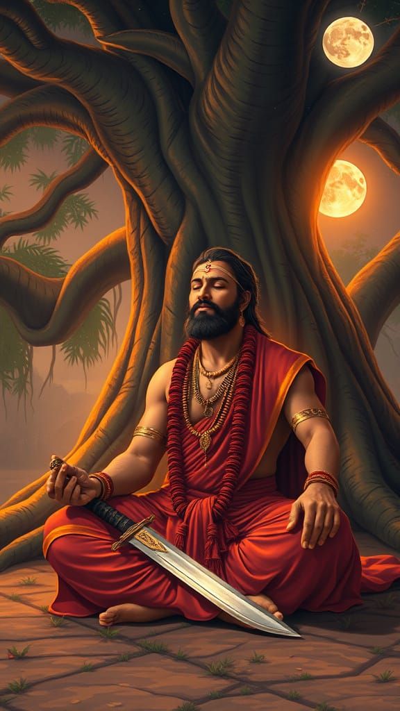 A serene warrior in traditional Indian clothing meditates under a banyan tree. Soft, warm lighting and a cosmic aura surround him, rendered in the style of traditional Indian art with warm tones.