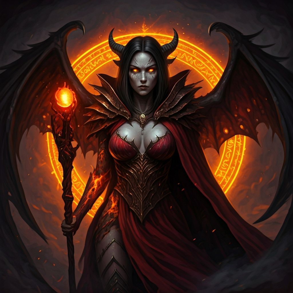 This image shows a powerful sorceress in a dark fantasy style. The scene features dramatic lighting and intricate details, with a focus on arcane elements and a smoky background. The sorceress has bat-like wings.