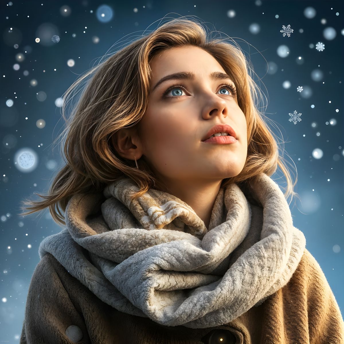 This image shows a beautiful woman with blue eyes and light brown hair standing in the snow. She gazes up at the stars in a serene and magical moment.