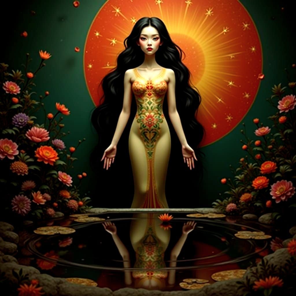 A hyperrealistic portrait of a beautiful Geisha with black hair and green eyes. She is wearing an ornate dress and touching a mirrored reflection against a cosmic background.