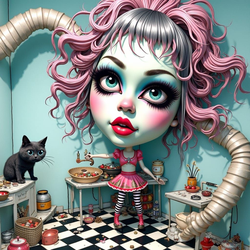 A surreal image of a goth-punk woman with a black cat in a kitchen. The scene is rendered with distorted digital textures and vibrant neon colors, in a futuristic and psychedelic style.