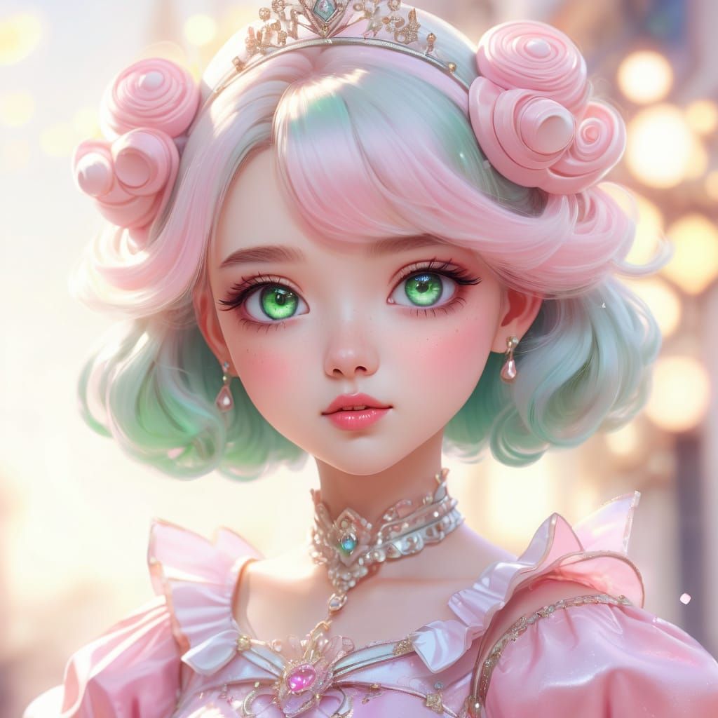 A close-up portrait of a kawaii little cyborg princess in soft pastel colors, with sparkling green eyes and a sweet expression, set against a gentle lighting background, rendered in highly detailed digital painting style.