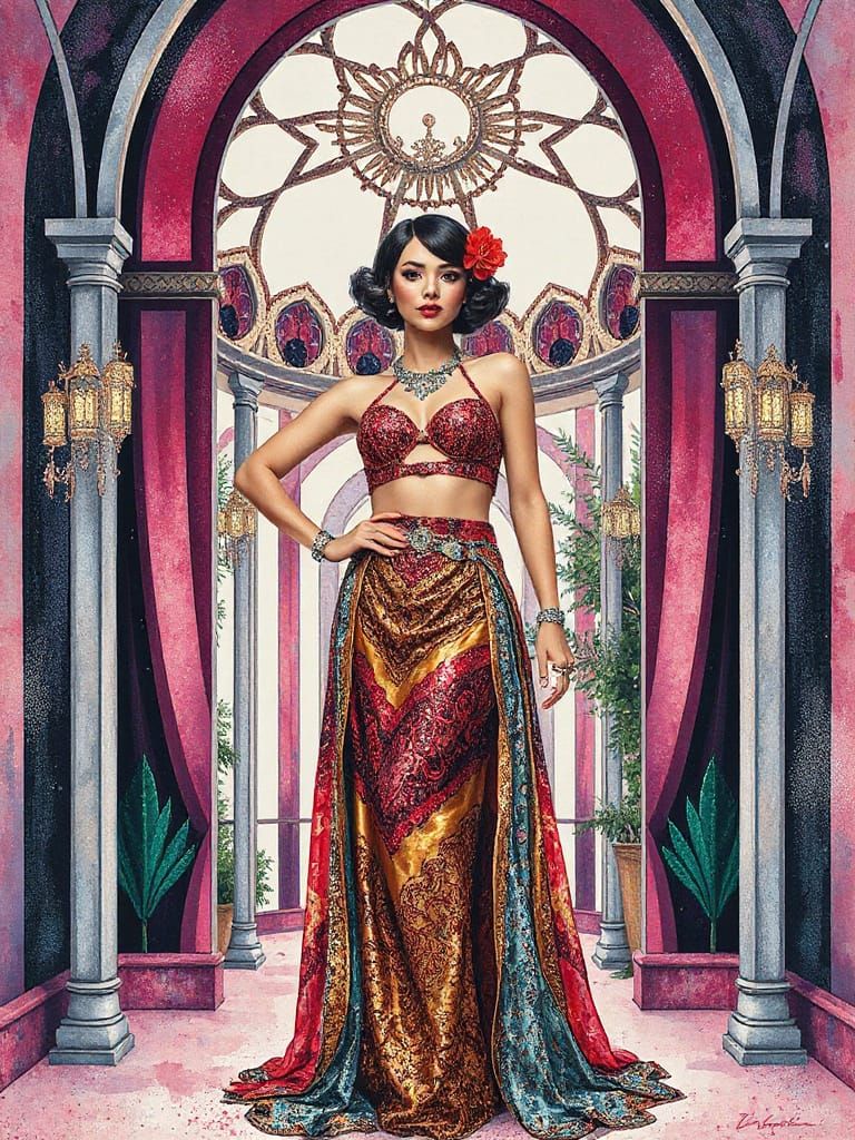 A vibrant image of a woman in art deco surroundings. This artwork features mixed media elements, a rich magenta, gold, and silver palette, and textured, geometric patterns.