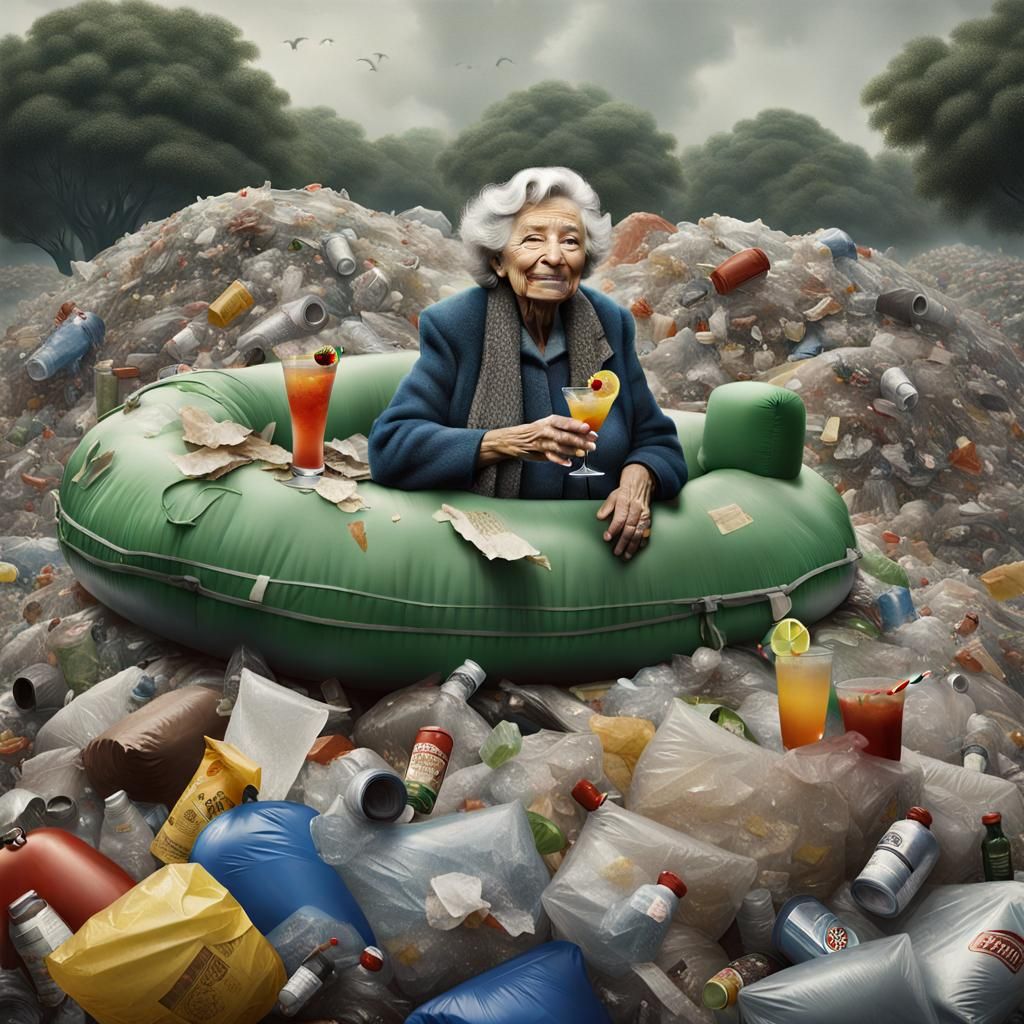a high quality professional photograph of a smiling old woman drinking a cocktail and laying in an inflatable raft on top of an enormous mound of garbage and trash, highly detailed, overcast, fine detail, 3D, textured, texture, overcast, urban, photorealism, realistic, professional photography, diane ...