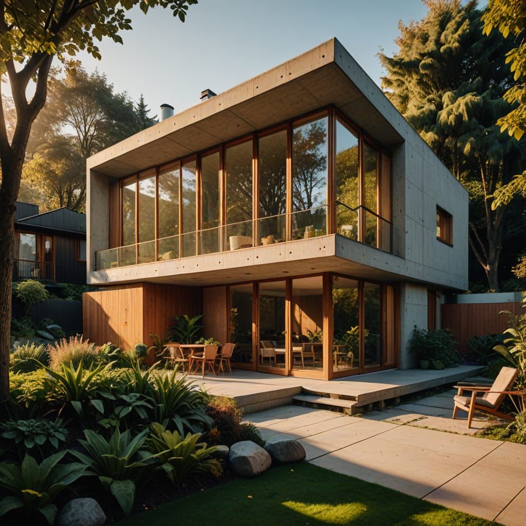 This image shows a modern two-story house constructed from concrete and wood, featuring a winter garden and terrace. The house is surrounded by a lush green garden, captured in golden hour lighting, as architecture photography.