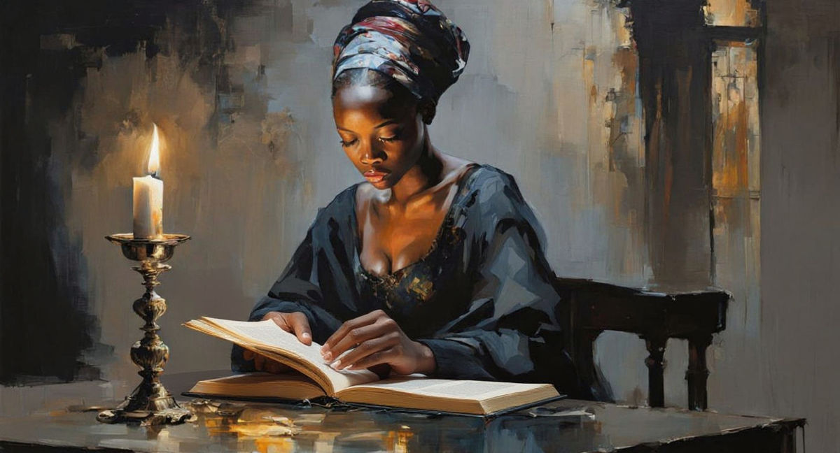 A striking picture of a Nigerian woman reading by candlelight in a dimly lit room. The minimalist portrait features intricate details and a surreal, alcohol ink aesthetic.