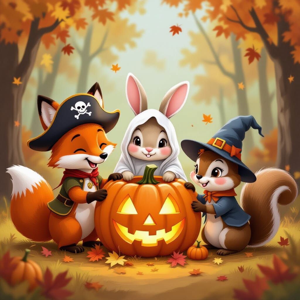 This charming illustration depicts woodland creatures dressed for Halloween in a forest clearing. Featuring a fox, rabbit, and squirrel with a glowing jack-o'-lantern, rendered in a whimsical, storybook style.