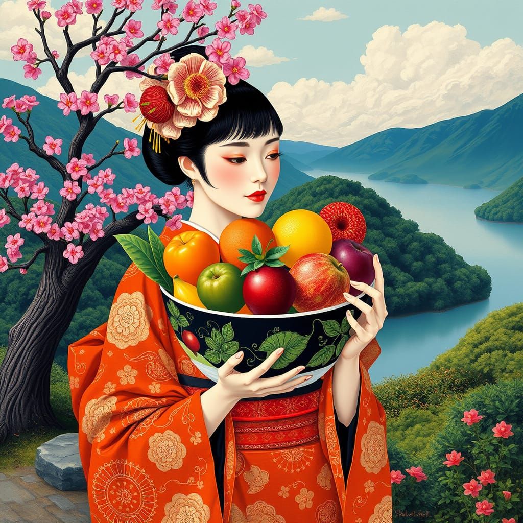 A serene image of a Japanese woman in a traditional kimono holding a fruit bowl. The artwork blends pop art, abstract, and impressionistic elements in a vibrant style.