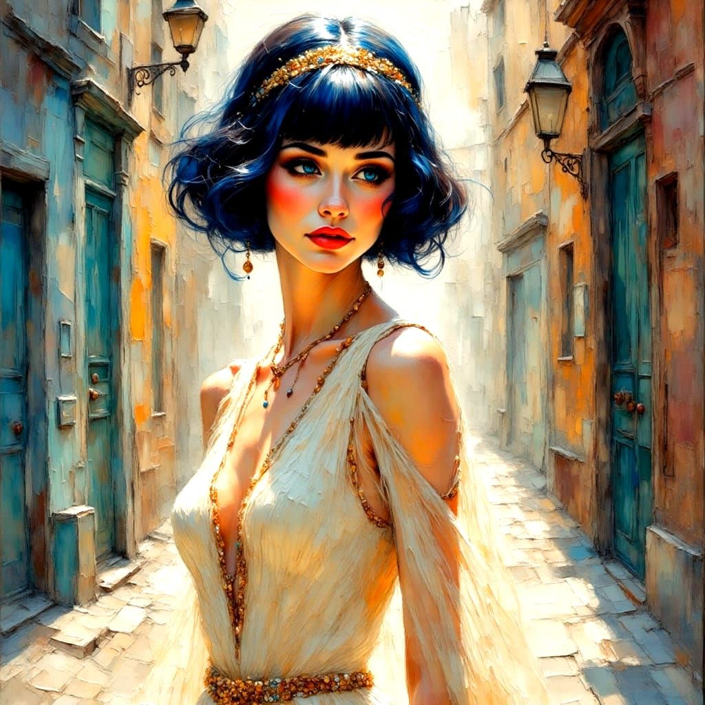 This image shows a 1920s woman in a flapper dress walking down an art deco street. It is rendered in a style that blends impressionism and photorealism using translucent colored wax.