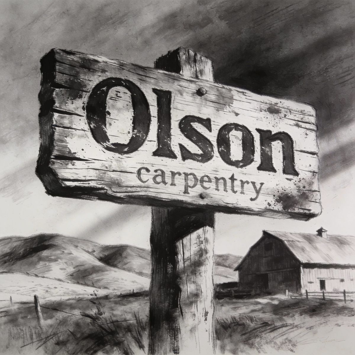 A hyperdetailed charcoal drawing of a rustic farmhouse sign reading "Olson" with "carpentry" below. Features visible wood grain and dramatic lighting, evoking emotional depth.
