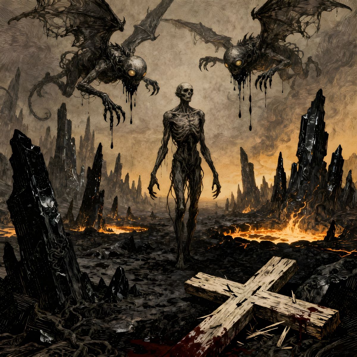 A dark fantasy scene depicts a twisted figure and grotesque demons in a hellish landscape, featuring a shattered cross, rendered in an eerie etching style with ominous lighting.