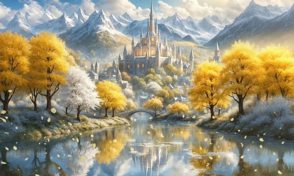This image depicts a serene elven valley scene, with delicate, translucent yellow petals gently floating in the foreground, enhancing the magical atmosphere.