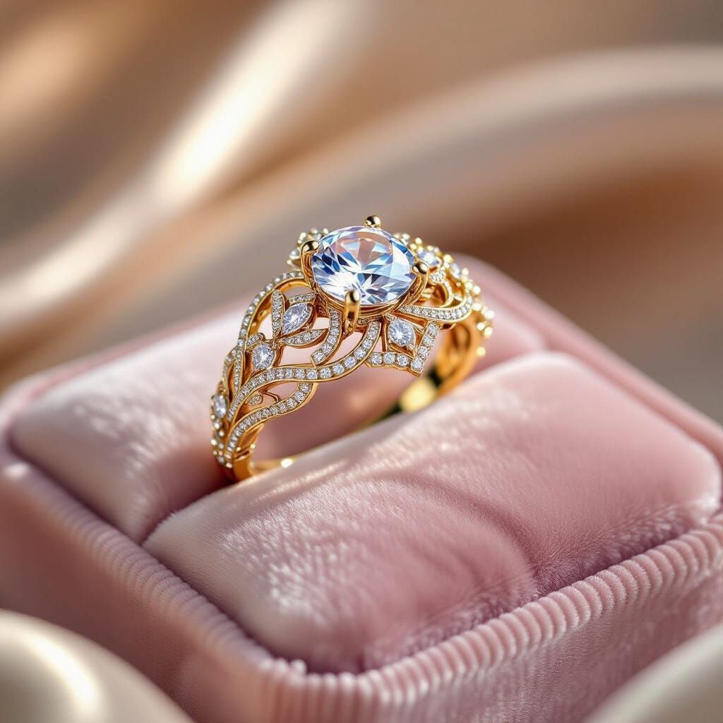 A detailed digital rendering of an ornate ring on a velvet pillow. The ring features delicate filigree and sparkling details in the style of luxurious, high-end jewelry.