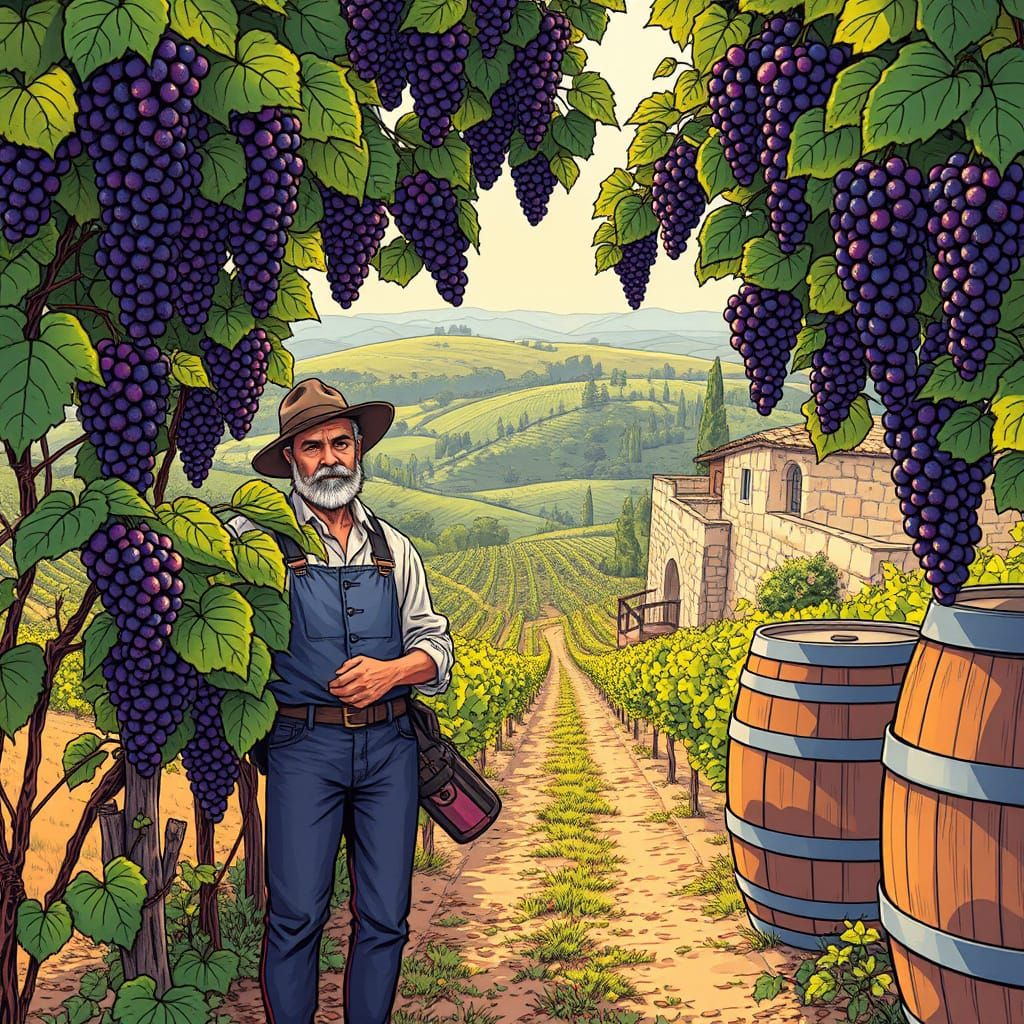 This image depicts a wine-maker amidst lush vineyards, surrounded by overflowing grapes and rustic stone walls, bathed in warm golden lighting with detailed, bold lines and vibrant triadic colors reminiscent of classic Italian comics.