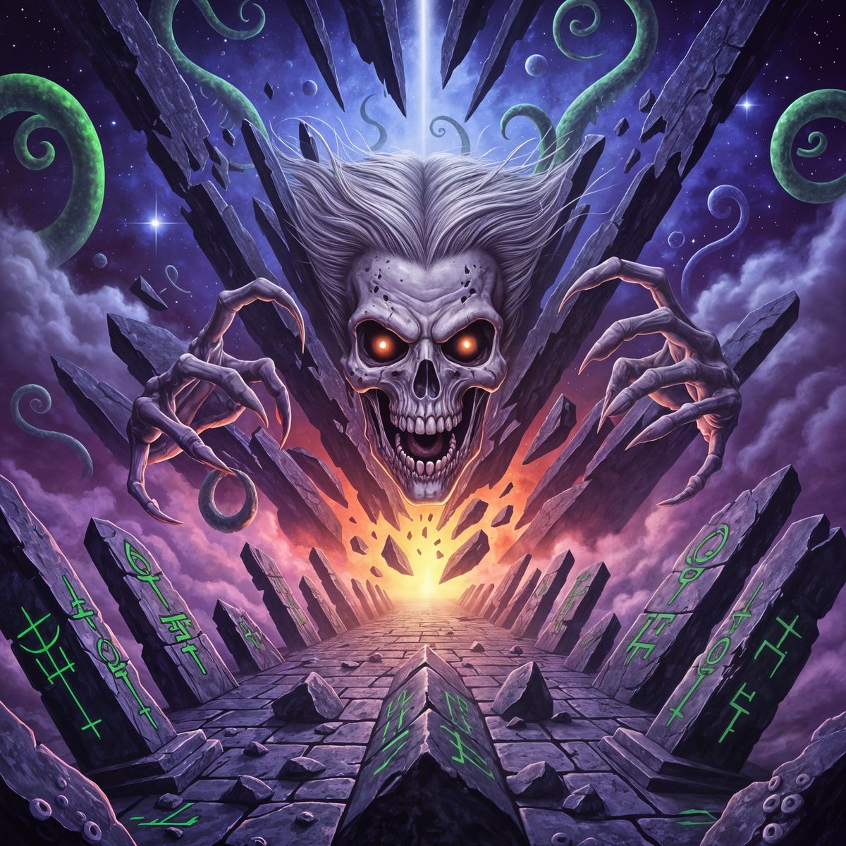 A hyperrealistic airbrushed illustration depicting an undead mascot's skeletal face emerging from impossible architecture. Extreme chiaroscuro lighting, cosmic fog, and deep colors create a surreal, otherworldly scene.