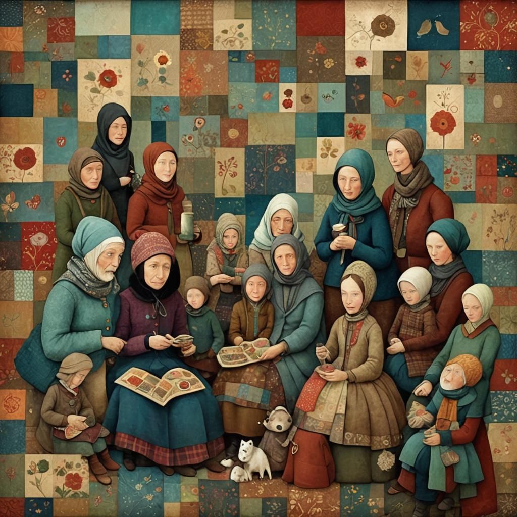 This heartwarming image shows women of diverse ages coming together to create beautiful patchwork art, evoking a sense of community and craft