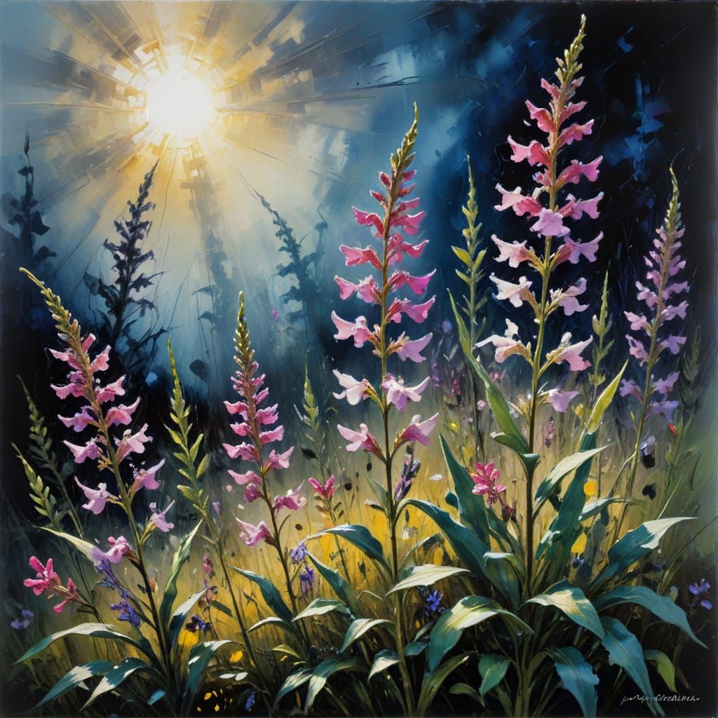 A vibrant abstract oil painting of penstemons in a flower garden, illuminated by dramatic lighting. The artwork employs encaustic techniques to enhance its detailed and bright aesthetic.