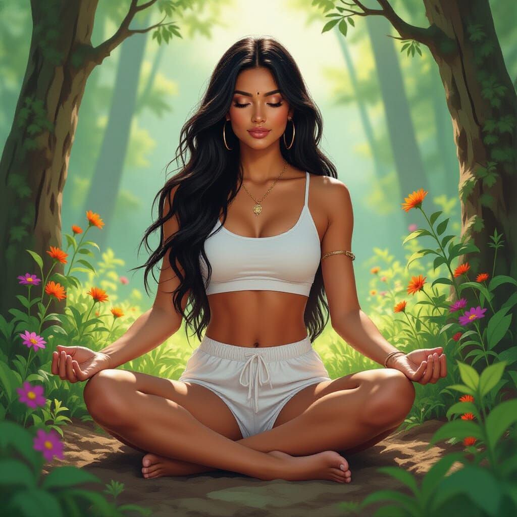 A serene image of an Indian woman connecting with nature in a lush forest. The artwork evokes a healing aura with earthy tones and organic textures, reminiscent of art nouveau.