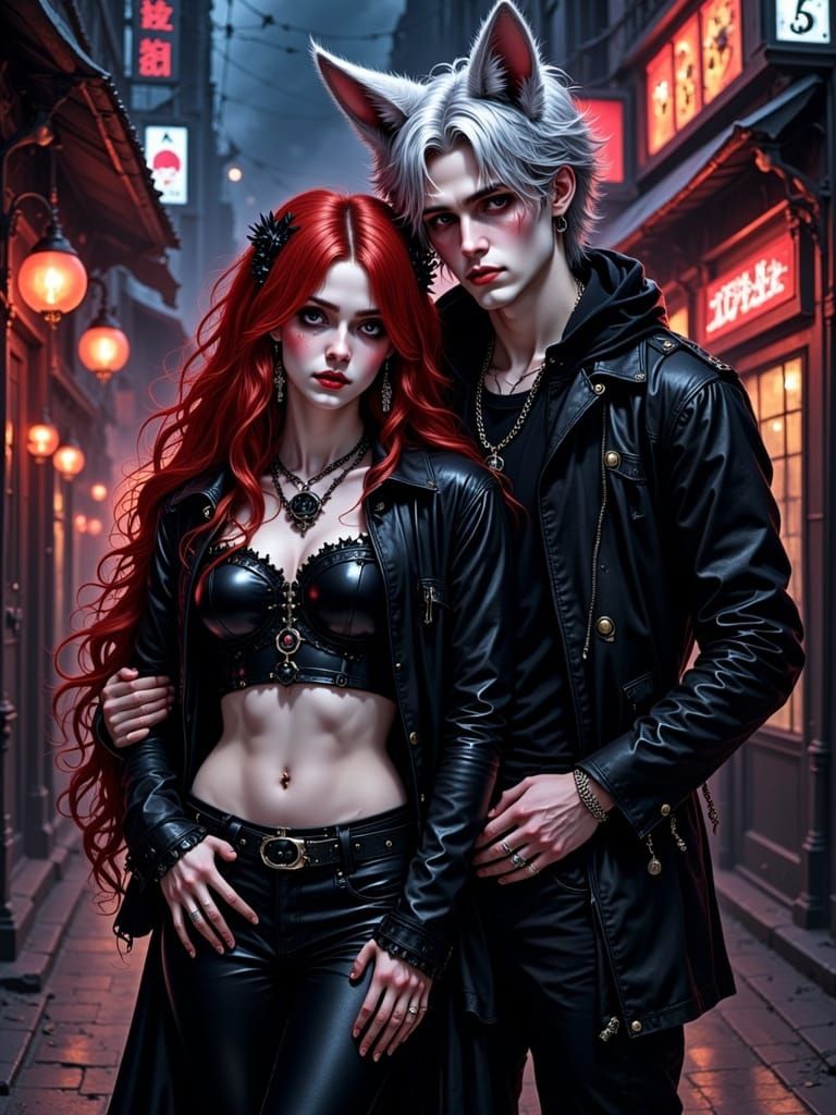 A stylish anime couple in a moody cyberpunk alley at night. The illustration features soft lighting and detailed semi-realistic shading, capturing their gothic streetwear and intimate connection.