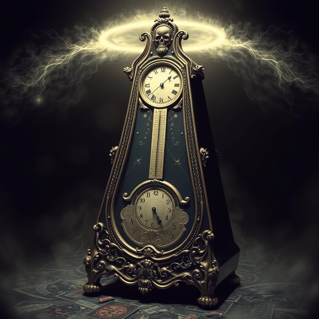A surreal image shows a vintage metronome emanating dark energy and distorting time. This artwork blends mystical and eerie styles with intricate detail, resulting in a captivating yet unsettling scene.