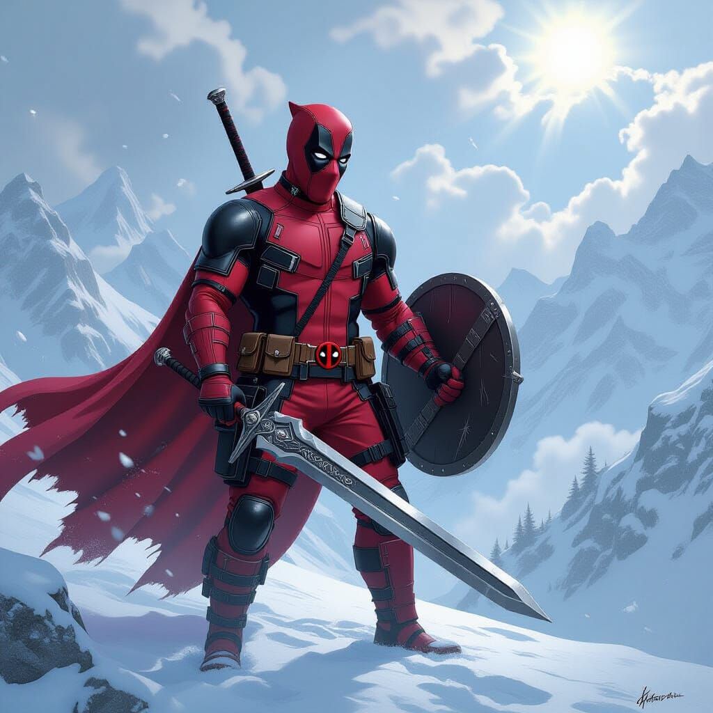 This detailed digital painting shows Deadpool in a Skyrim-inspired outfit, wielding a dragonbone sword and shield on a snowy mountain pass with dramatic sunlight. Inspired by epic fantasy concept art.
