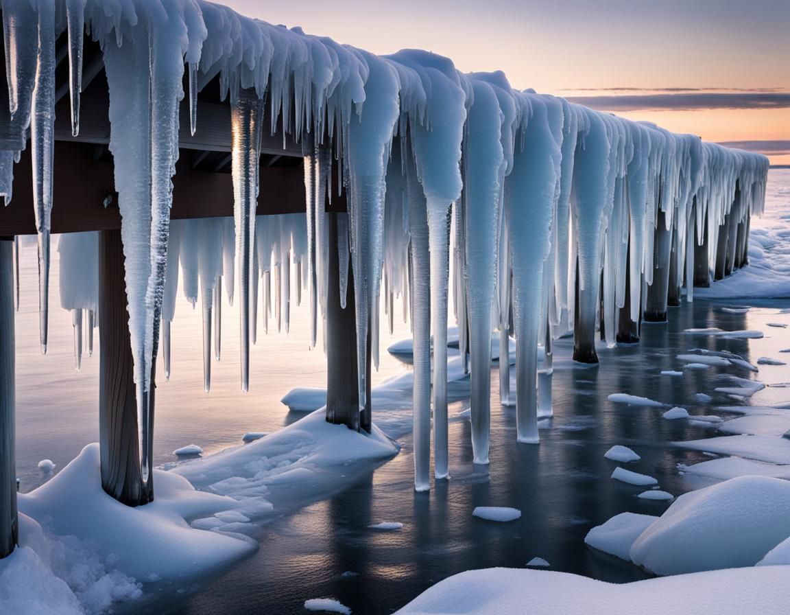 This image shows a Lake Michigan pier covered in ice formations during the magic hour. Volumetric lighting and intricate details create a cinematic winter landscape.