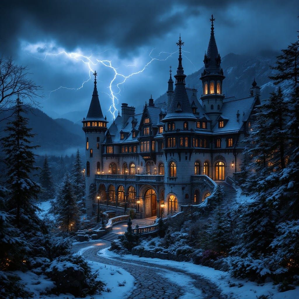 This image shows a luxury grand hotel in Transylvania at night. The scene is set with a thriller atmosphere, cool tones, and thunderstorms in the sky, creating a mysterious mood.