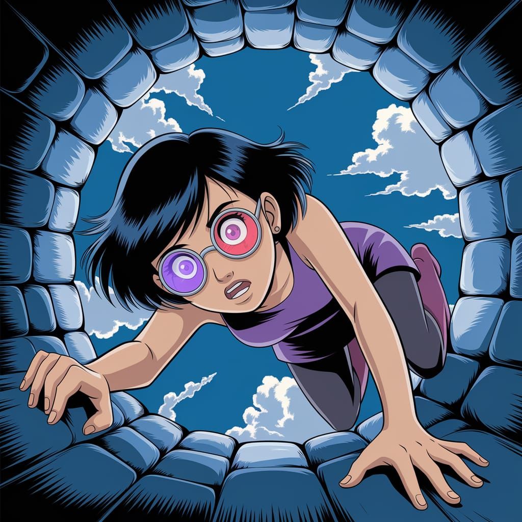 This image shows a young woman with short black hair and futuristic glasses desperately clinging to the edge of a dark stone tunnel. She is depicted in a retro anime style.
