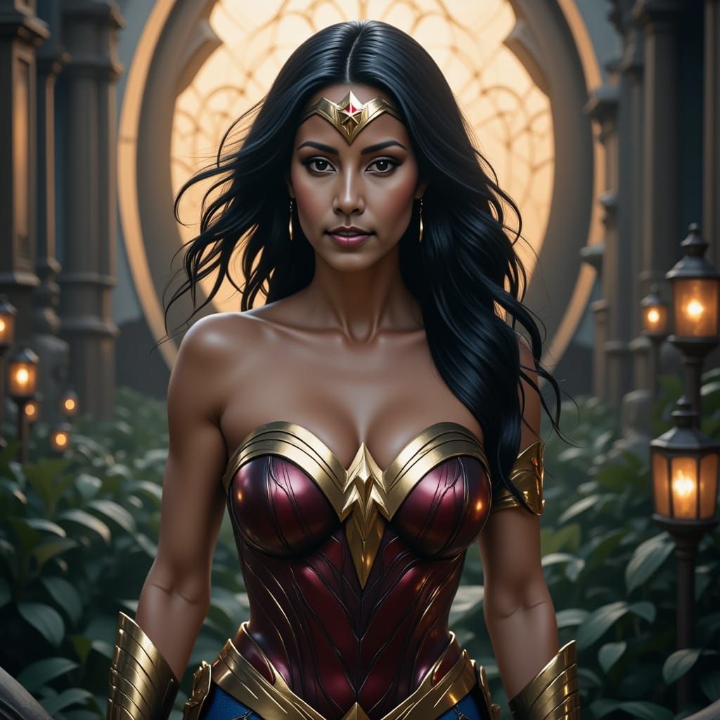 This cinematic image captures Rosa dressed as the iconic Wonder Woman, with a nostalgic film grain aesthetic and dramatic lighting reminiscent of a 35mm live-action film still.