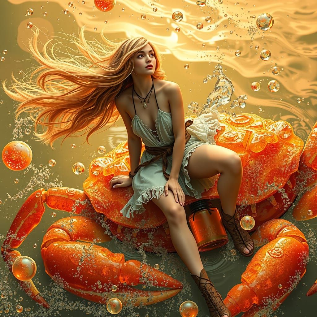 A striking picture of a young woman with golden hair and tattered clothes riding a giant gummy crab. The scene is set in an effervescent sea with warm golden, tangerine, and bronze colors, in a neon futuristic style.