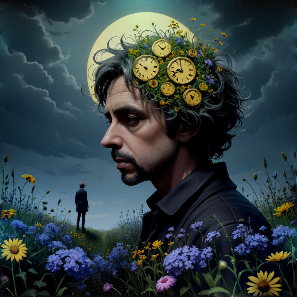 "A surreal cartoon nightmare Artwork Of Tim Burton behold, <:3d optical illusion, award-winning, highly detailed and textured, SURREALISM:1.0>Digital painting. Medium shot. A person with a clock for a face, standing in a field of wildflowers. The scene is surreal and dreamlike, with soft, muted hues and delicate brushstrokes. Mark Rothko and Richard Estes style. Intricate details, flowing lines, and organic shapes. A masterpiece, best quality, 8k resolution, trending on Artstation, Unreal Engine. Hyperrealistic, splash art, concept art, mid shot, intricately detailed, color depth, dramatic, side light, colorful background."