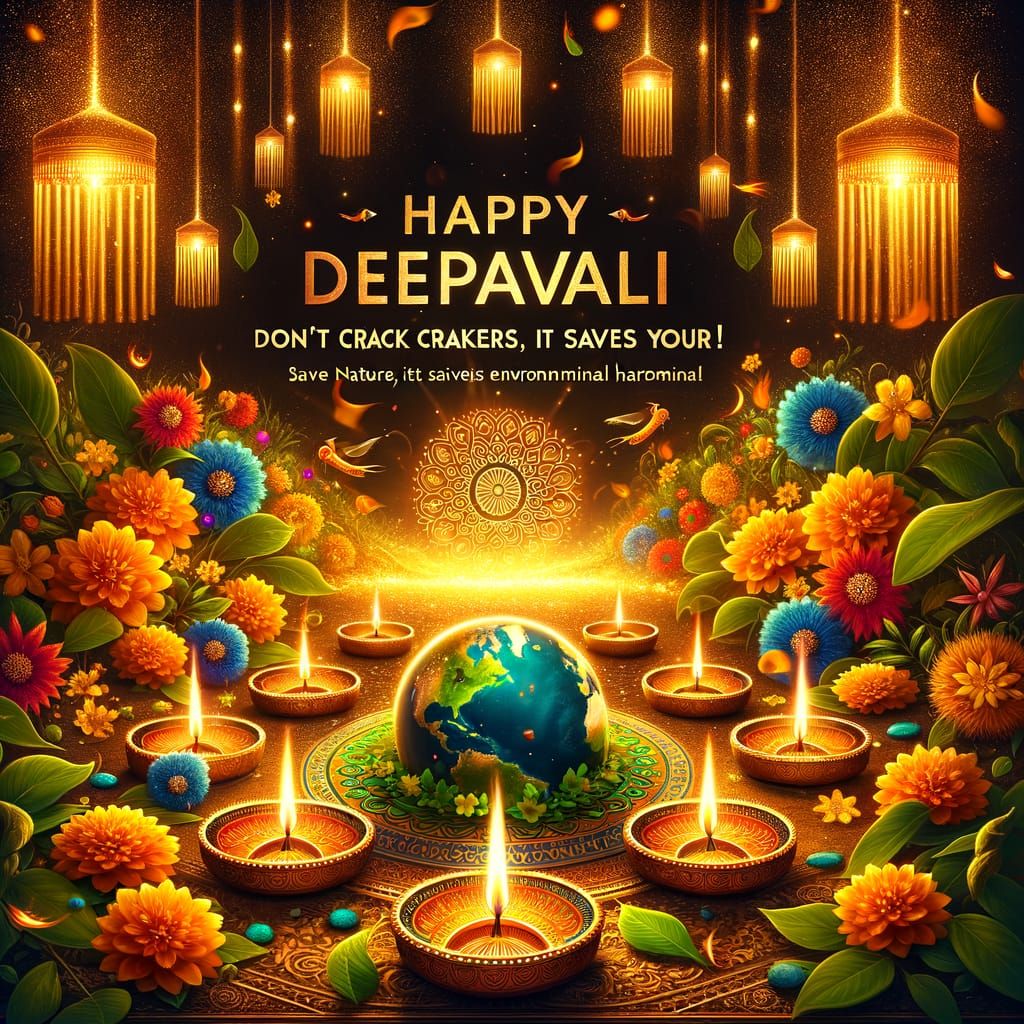 This digital art showcases a nature-friendly Deepavali with glowing diyas, rangoli, flowers, and leaves replacing fireworks. Celebrate joy and peace with warm golden tones and intricate detail in this modern festival poster.