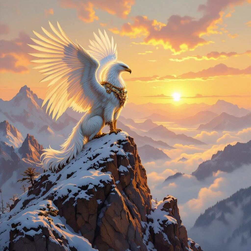 A stunning image of a griffin on a snowy mountain. The creature is adorned in baroque-style clothing, its iridescent feathers catching the sunlight in this classical-style oil painting.