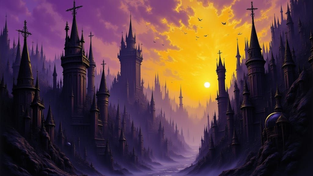 This image depicts a vast, unsettling gothic city with intricate spires and shadowed alleys, rendered in a dark fantasy concept art style. Dynamic lighting highlights a vivid purple and yellow color palette, reminiscent of Art Nouveau.