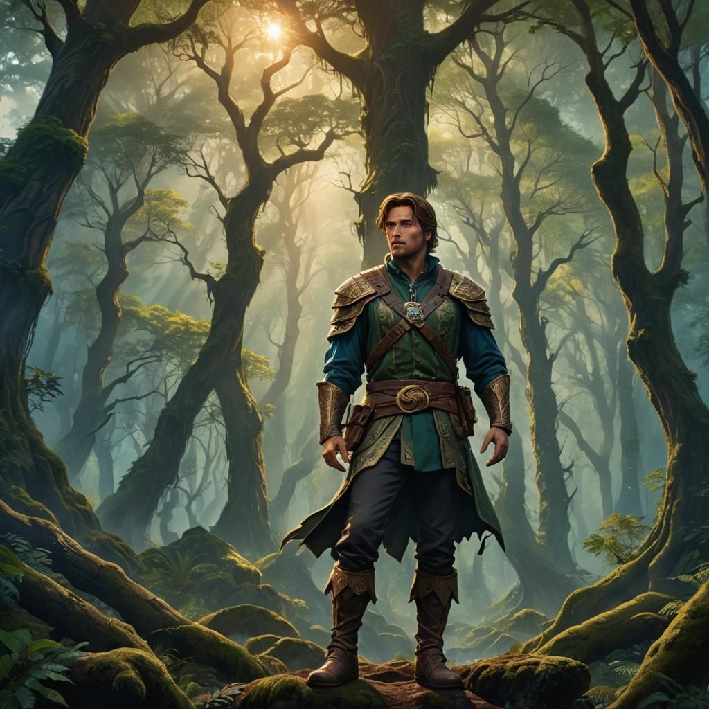 A heroic man named Ez stands in an ancient forest in this fantasy art piece. Golden light filters through the trees, set against cool, blue mist and lush foliage in a magical realism style.