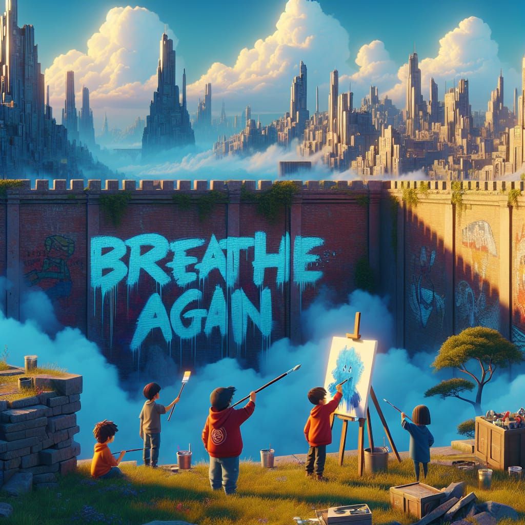 This image shows children painting a fantasy city wall with 'Breathe Again' graffiti. The detailed matte painting style features deep colors and intricate fantasy concept art elements, presented in high resolution.