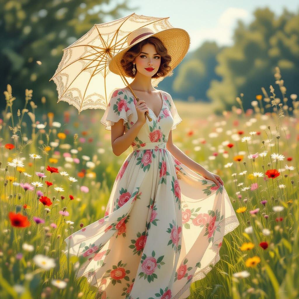 A woman in a 1940s floral dress and hat holds a vintage parasol in a sunny meadow. The image evokes a romantic, dreamlike atmosphere with soft, impressionistic brushstrokes and rich colors.