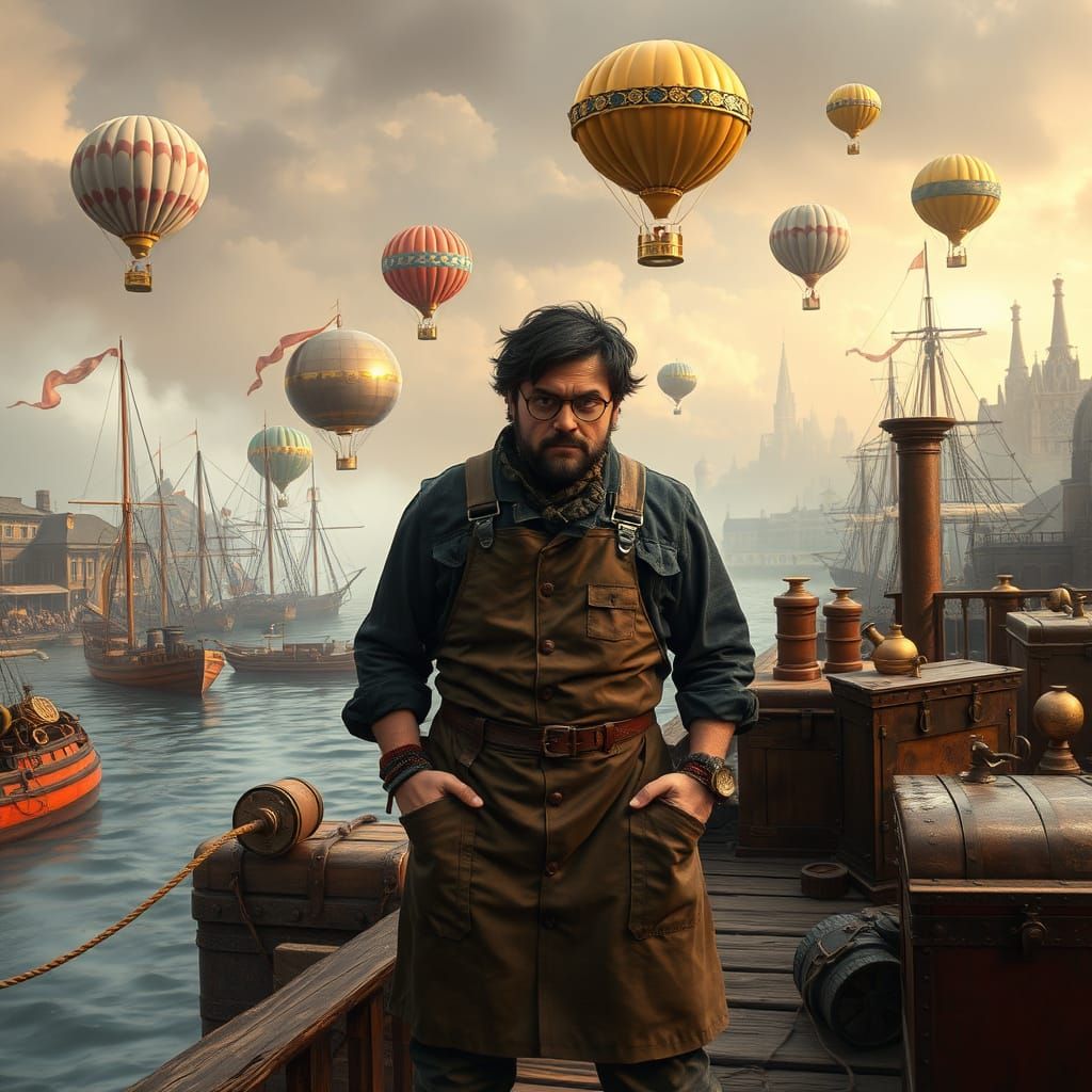 This image depicts a Victorian-era artificer standing on a dock, surrounded by his contraptions and tool-laden chests, as majestic sailing ships and steam-powered vessels dock in the harbor. Above, a flotilla of helium balloon ships soar through the clouds, evoking a sense of nostalgia-tinged wonder and ...