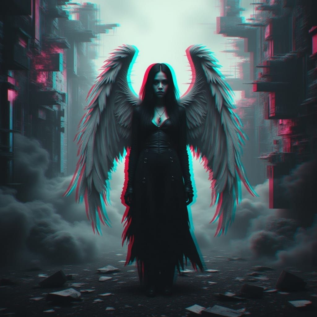 This image shows a fallen angel with dark hair and pure black eyes standing in a chaotic, glitched dystopian world with distorted neon lights. The image evokes a dark, bio-mechanical aesthetic.