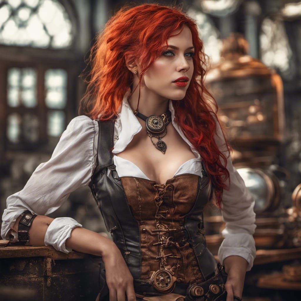 This image shows a beautiful steampunk artificer girl with red hair. The digital illustration features intricate details, elegant design, hyper-realistic rendering, and dynamic lighting in 8k resolution.