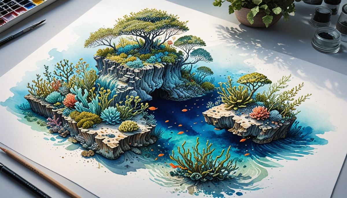 This image depicts a serene tropical island scene, with intricate watercolour details and a delicate depiction of underwater corals and seaweed in a clear blue sea.