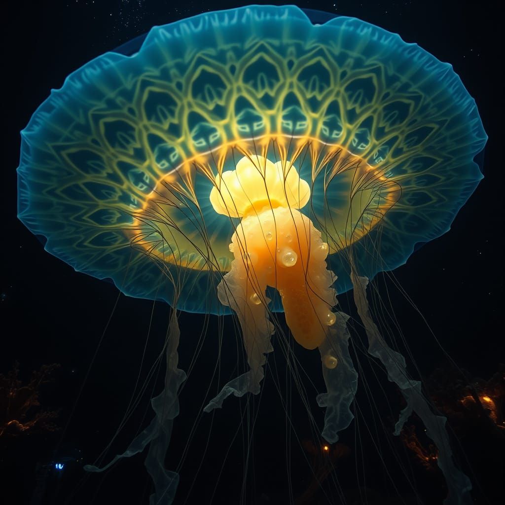 This image shows a colossal jellyfish with a translucent body undulating in the darkness. Bioluminescent patterns illuminate its form, while its tentacles drift among phosphorescent sea creatures in a deep-sea abyss.