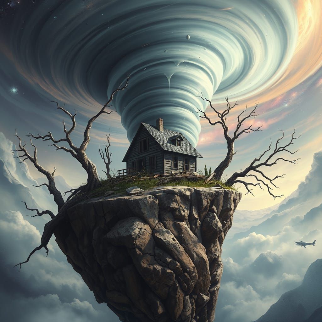 A surreal fantasy scene featuring a house on a floating island under a cosmic tornado. Cracked trees and nebulae fill the dreamy, vibrant sky.