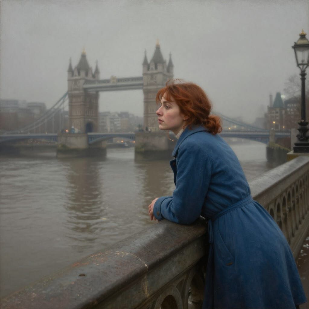 This atmospheric oil painting captures a woman in a vintage coat by Waterloo Bridge, looking into the misty Thames. Moody lighting and desaturated colors create a melancholic mood.