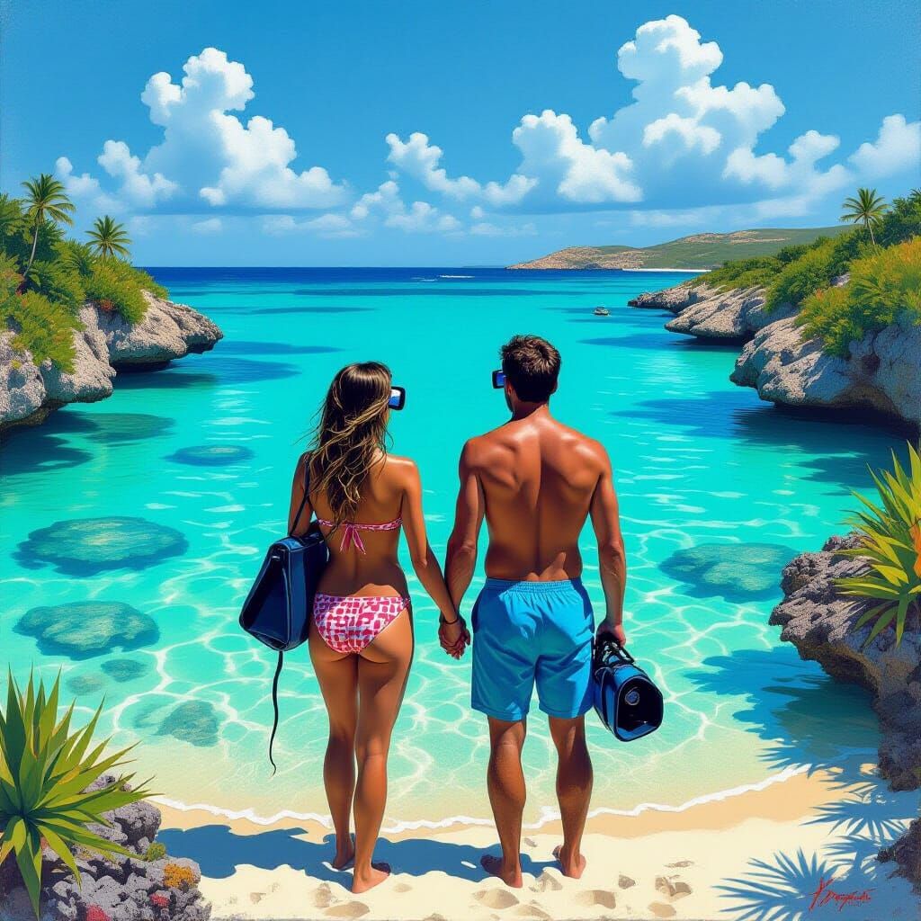 This image shows two people in swimsuits and snorkeling gear standing on a shore. The bright blue shallow waters of the Spanish Lagoon in Aruba are surrounded by lush greenery in this hyperrealistic digital rendering.