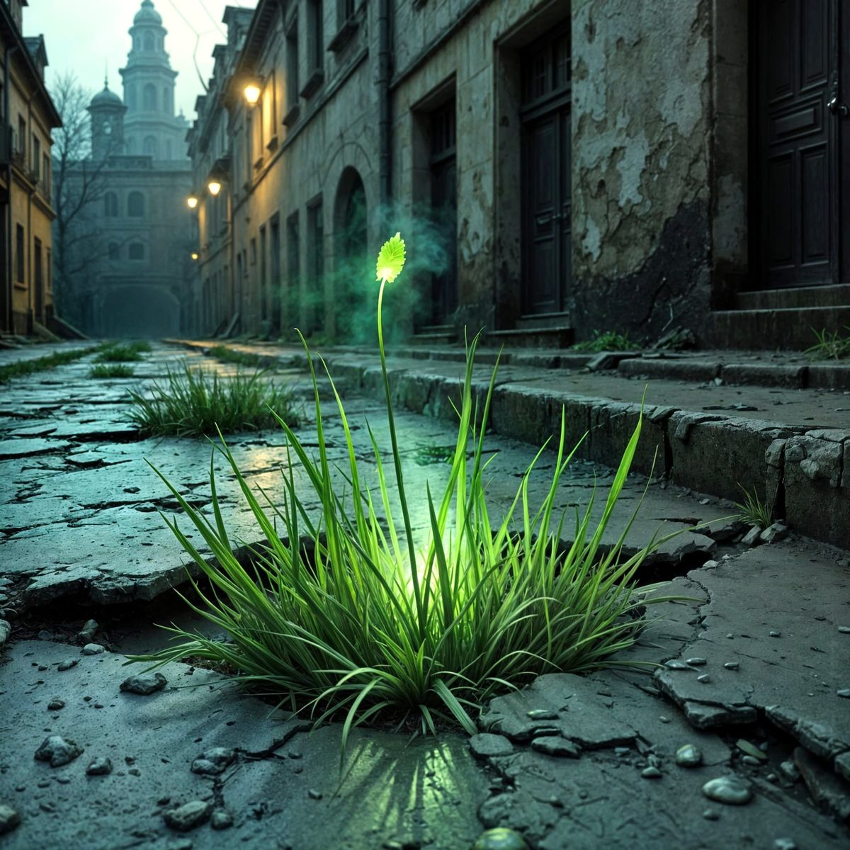 The grass is always greener in the cracks of broken concrete, rendered in the haunting, hyper-detailed dystopian surrealism of Zdzisław Beksiński, a single blade glowing with unnatural neon green against desaturated, crumbling urban decay, 8k resolution lora:MoodySurrealism:1.0