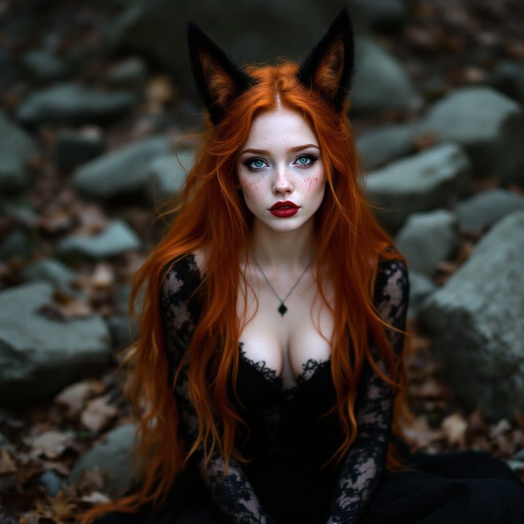 This image is a dark fantasy portrait of a young woman with copper-red hair and fox ears, set in a moody forest with vibrant colors and detailed textures.